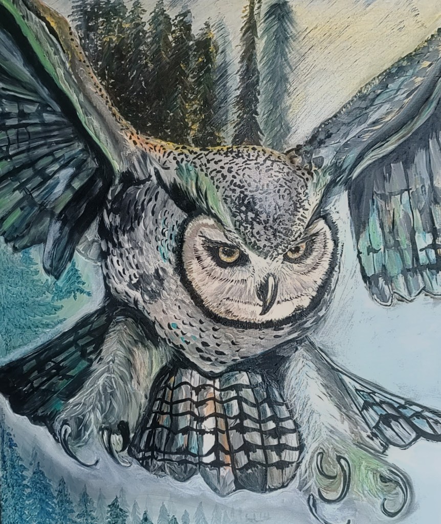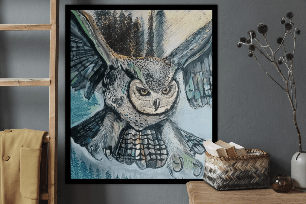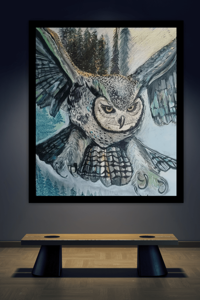 Vanuit een ingetogen, atmosferisch landschap verschijnt de uil op het grensvlak tussen beweging en stilte. Zijn aanvwezigheid is zowel beheerst als instinctief, gekenmerkt door spanning, helderheid en een stille kracht.